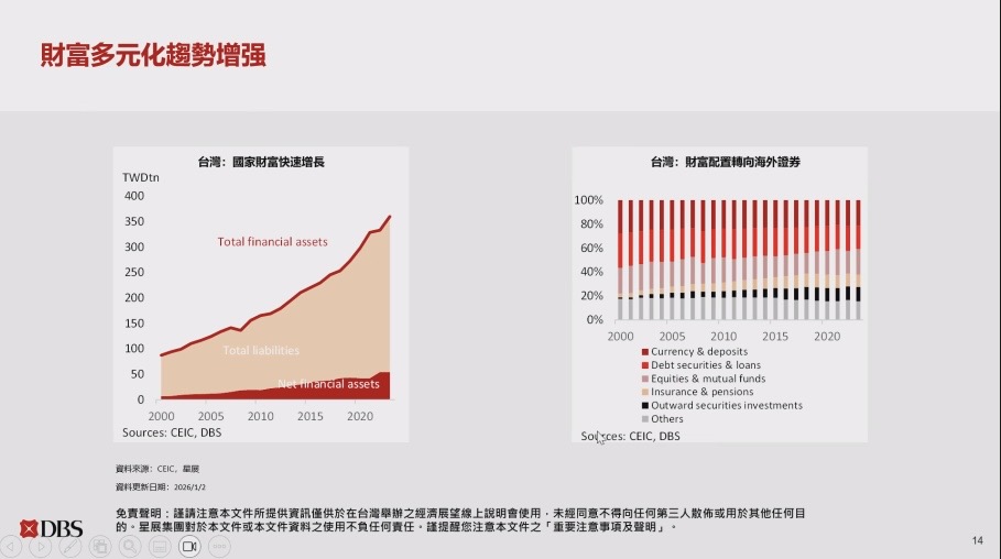 財富配置方面,馬鐵英強調,台灣投資人的海外金融資產仍以美元資產為主,根據投信投顧公會資料,境外基金投資中,全球型基金的配置比重有所提升,考量美股評價偏高、美債殖利率波動,以及美元走弱風險,預期 2026 年台灣投資人將加快金融資產配置多元化的步伐。