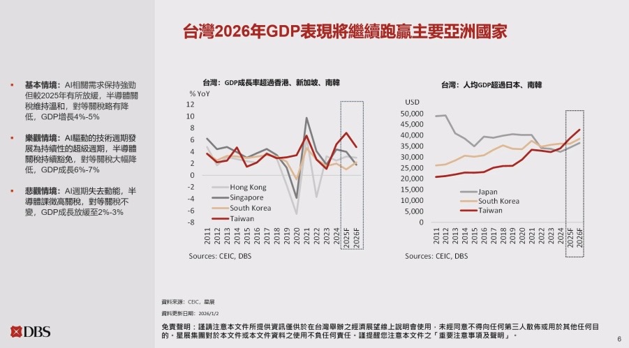 展望 2026 年,馬鐵英表示,星展將台灣 GDP 成長預測上調至 4.8%,因美國半導體關稅處於溫和水準,對台對等關稅略為下調,這意味著今年台灣仍將是亞洲四小龍中成長最快的經濟體,領先香港、新加坡與韓國,人均 GDP 與日韓之間的差距將持續擴大。