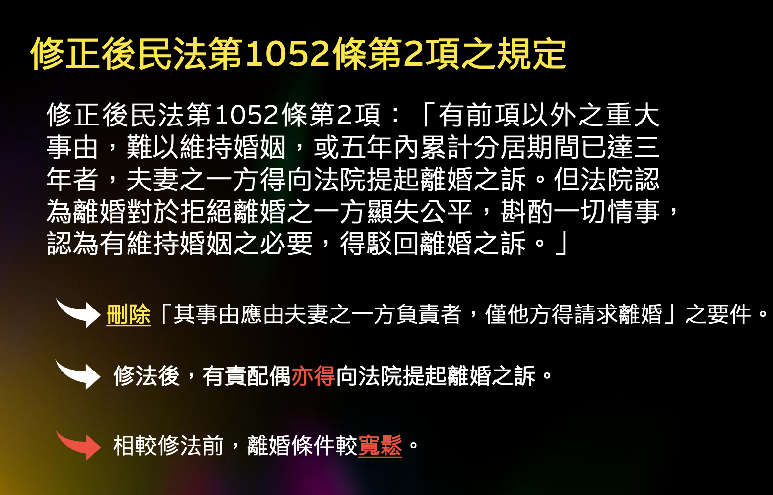 目前民法已對裁判離婚要件予以放寬,預期未來法院判准離婚可能性將會升高,預先訂立財產分配之婚前協議,有助安排以及緩和離婚所帶來之財產分配影響;而《職業安全衛生法》已正式將職場霸凌各項規定納入規範,企業有妥善預防、善盡調查及正確懲處霸凌的法律義務。