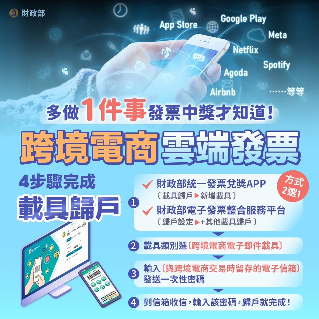 財政部表示,民眾若曾在 Netflix、Spotify、YouTube Premium 等平台訂閱服務,或透過 App Store、Google Play 購買應用程式,這些跨境電商都會開立雲端發票,許多民眾經常遺漏跨境電商電子郵件載具的設定,導致中獎發票未能即時發現。