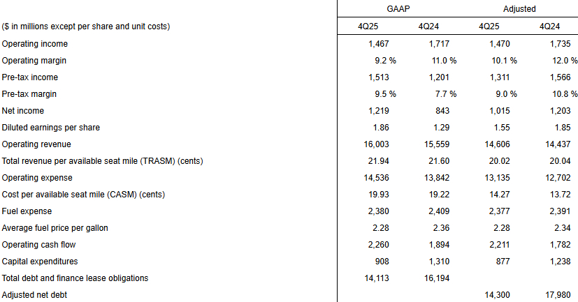 CNBC、路透等外媒報導,達美航空13日公布,2025年第四季經調整營收為146.1億美元,略低於LSEG統計的分析師預估值146.9億美元,經調整每股盈餘1.55美元,優於分析師預估的1.53美元。