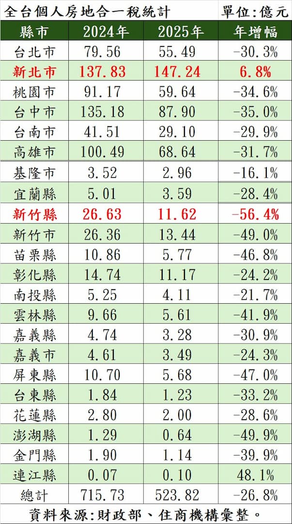 統計全台 2025 年個人房地合一稅收達 523.82 億元,年減 26.8%,首度出現負成長,其中 2025 年房地合一「稅收王」寶座,由新北市蟬聯,共達 147.24 億元,漲幅達 6.8%,為全台唯二仍有正成長的縣市,至於其餘五都,房地合一稅收皆大減 3 成,而台中衰退 35% 為六都跌幅最高。