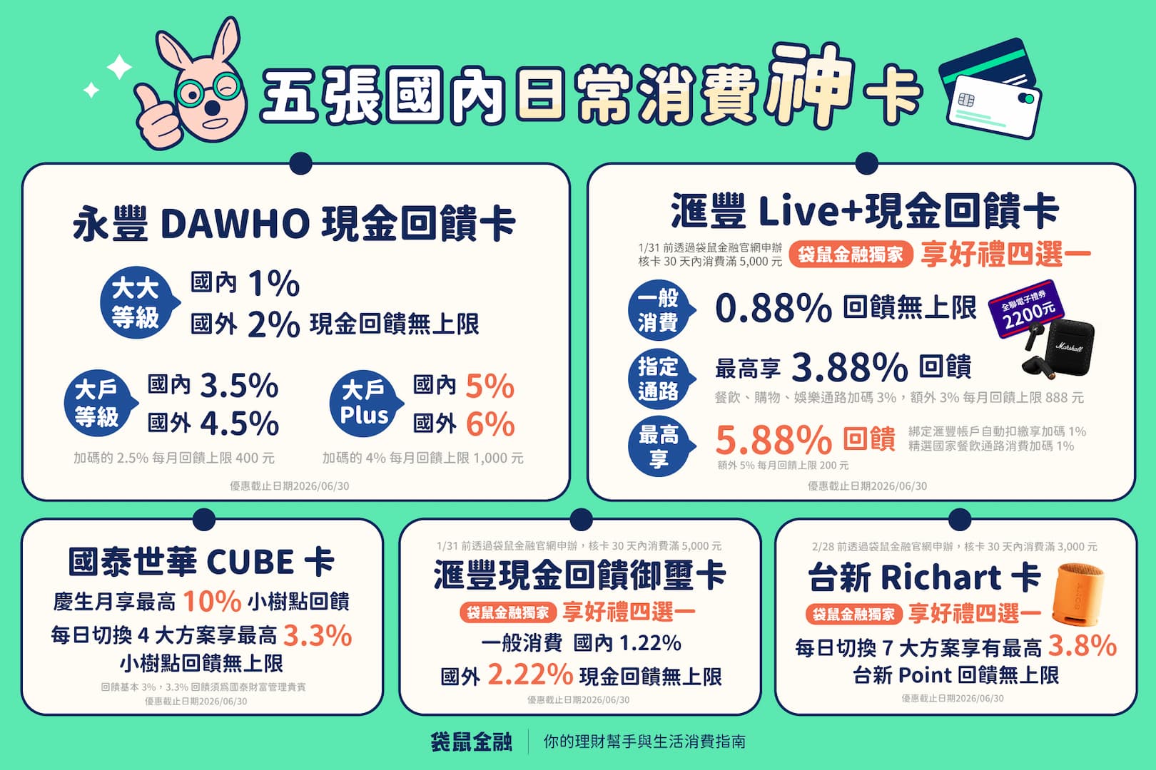 迎接 2026 年,各家銀行陸續調整信用卡回饋機制,袋鼠金融整理2026 年信用卡權益變化,從國內消費必備的五張神卡,其中升格大戶 Plus 用戶,享有國內 5%、國外 6%,而台新 Richart 卡,七大切換方案共 60 大通路可享有最高 3.8% 回饋,綁定 LINE Pay 更回饋 2.3% 台新 Point。