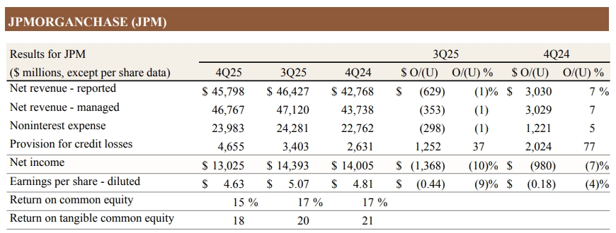 摩根大通13日釋出最新財報,受惠金融市場交易熱絡,2025年第四季營收年增7%至467.7億美元,優於華爾街預期的462.01億美元;淨利年減7%至130.3億美元,即每股盈餘4.63美元,主要因該公司取代高盛,取得蘋果信用卡Apple Card發卡權,須提列備抵呆帳22億美元。