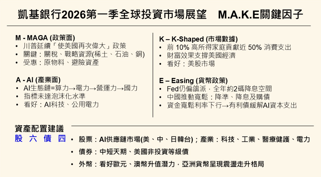 回顧 2025 年,川普重返執政、關稅戰及 AI 熱潮推升大盤的動能,全球股市幾乎全線收高,展望 2026 年,凱基銀行建議投資人,可從產業面、政策面、市場數據面掌握核心 M.A.K.E 四大關鍵因子策略,提前因應變化並布局資產。
