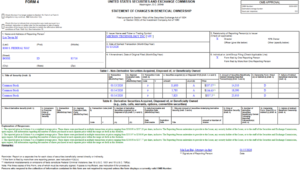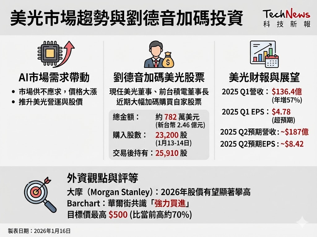 相關資料顯示,相關資料顯示,劉德音在 1 月 13 日與 14 日,分別以每股337.07、336.63、337.14 美元的價格,總計購入了 23,200 股自家美光的股票,總金額達到 782.17 萬美元。由於交易完成後,劉德音持有的美光股票來到 25,910 股,可以看出這次加碼購買自家股票的動作不小。