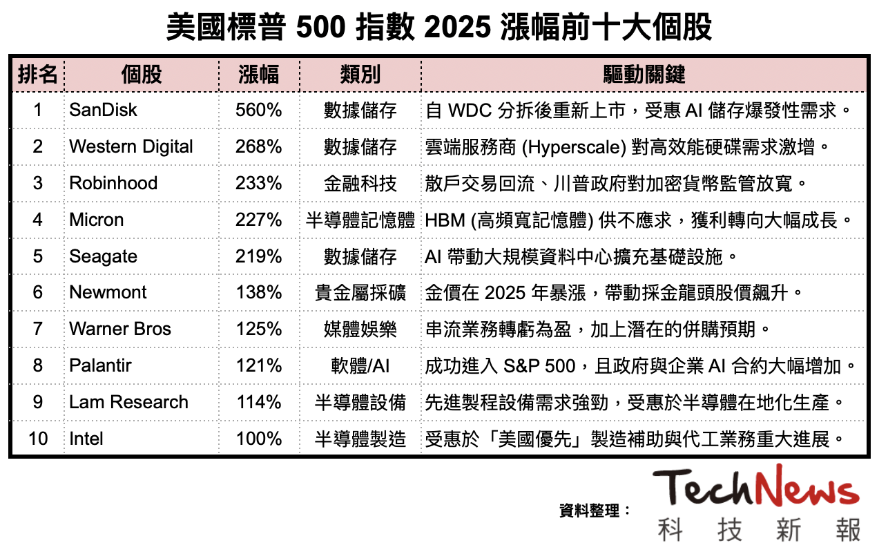 受惠半導體自主、能源擴張與 AI 需求,美國標普 500 指數(S&P 500)全年上漲約 17.9%,連續三年實現雙位數增長,並在年底多次刷新歷史新高,但全年漲幅前十大個股,今年由記憶體儲存相關個股意外成為最大贏家。