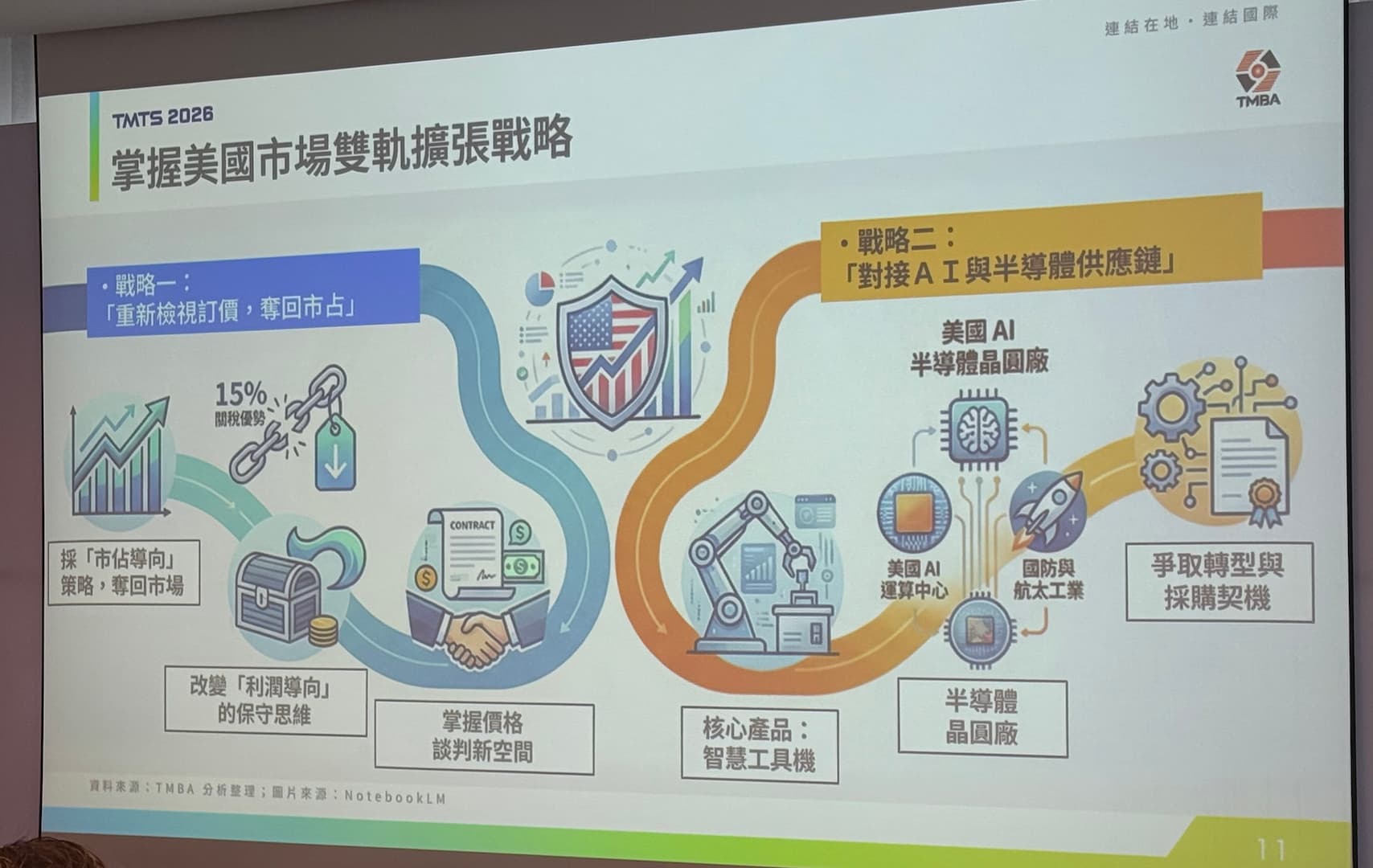 陳紳騰呼籲,會員廠商應妥善布局價格策略與談判空間,並積極思考跨產業合作、生態系聯盟與通路策略調整,同時加強與 AI、半導體供應鏈的對接,目前政府推動赴美投資未必是壞事,若能與 ICT 等產業共同出海,整合出口與投資布局,將有助擴大整體商機。