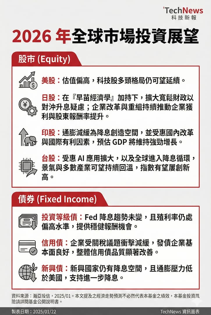 全球股市延續去年的多頭氣勢,市場普遍預期 2026 年行情仍值得期待。瀚亞投信表示,AI 浪潮持續發酵,將為美股、台股及亞洲供應鏈帶來更多成長契機,科技股今年的整體表現仍可望相對亮眼;相較美股而言,亞洲股市更具投資價值,尤其看好日本與印度市場。