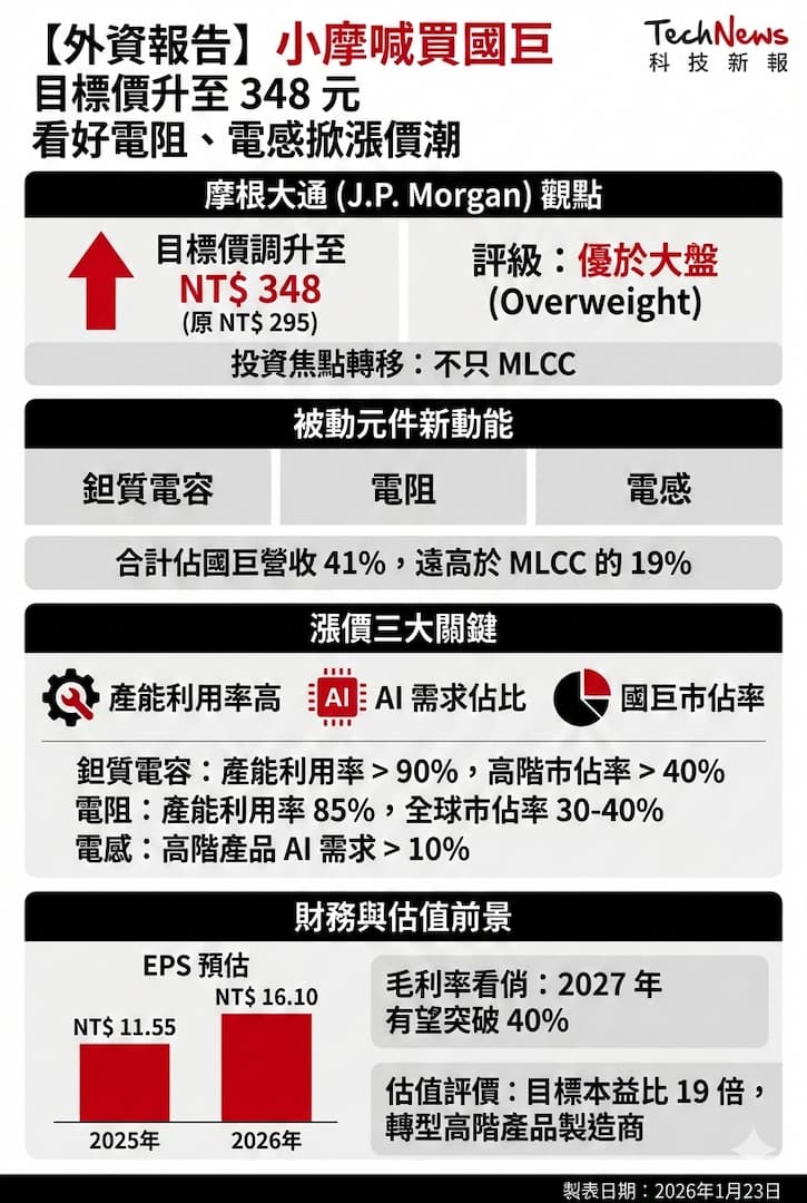 小摩強調,隨著鉭質電容、電阻和電感改變定價動態,國巨的毛利率將重回穩定成長軌道,並有機會在 2027 年突破 40% 大關,這將是自 2018 年被動元件缺貨潮以來的首見,受惠國巨正轉型為高階產品製造商,因此重申「優於大盤」評級,並將目標價調升至 348 元。