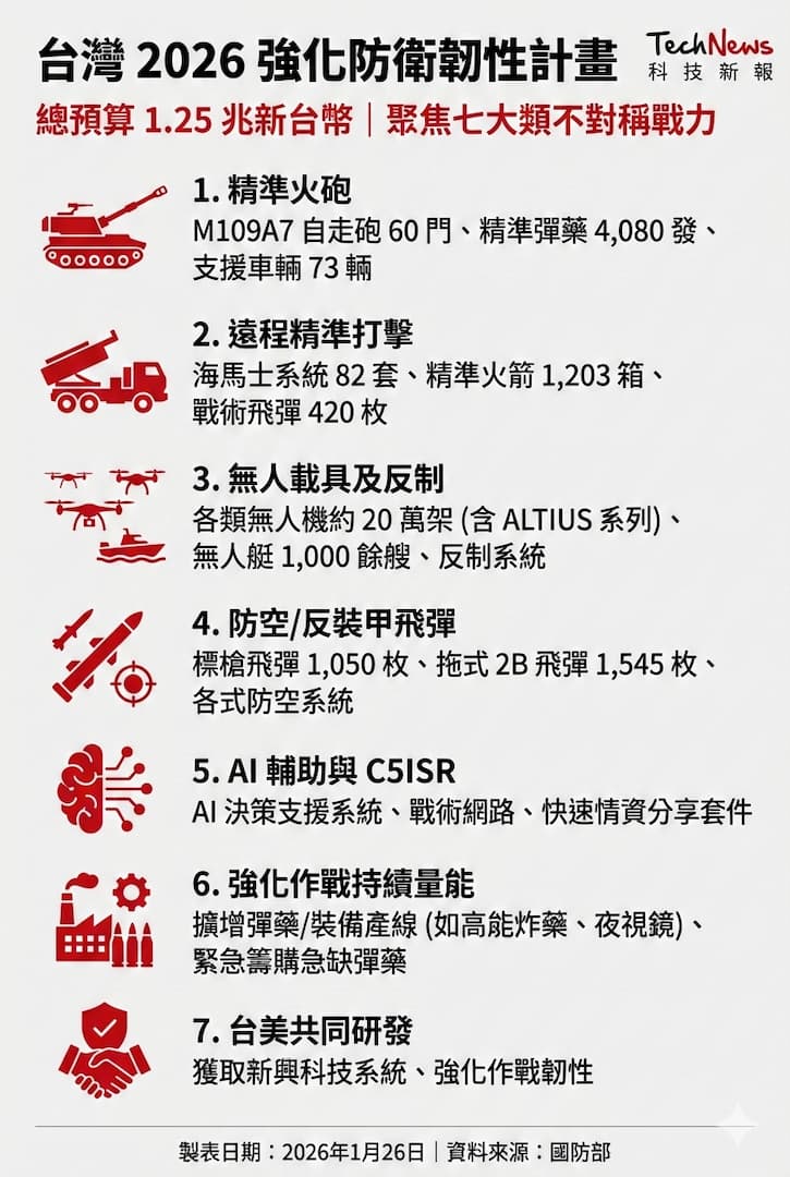 隨著國防部 2026 年最新「強化防衛韌性及不對稱戰力計畫」細節曝光,總額高達 1.25 兆新台幣的特別預算確立台灣軍工產業的黃金十年,預計採購七大類裝備,達成建構高度強韌、全面嚇阻防衛戰力的目標。