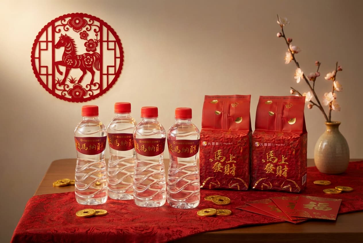 兆豐銀行今年特別規劃多款春節限定好禮,準備 8 萬瓶「駿馬納財」發財水及 5 萬包「馬上發財」發財米,自 2 月起陸續在全台各分行限量贈送,並結合全台 12 家分行舉辦名師揮毫活動,祝福客戶在馬年駿業騰飛、財運滿載。