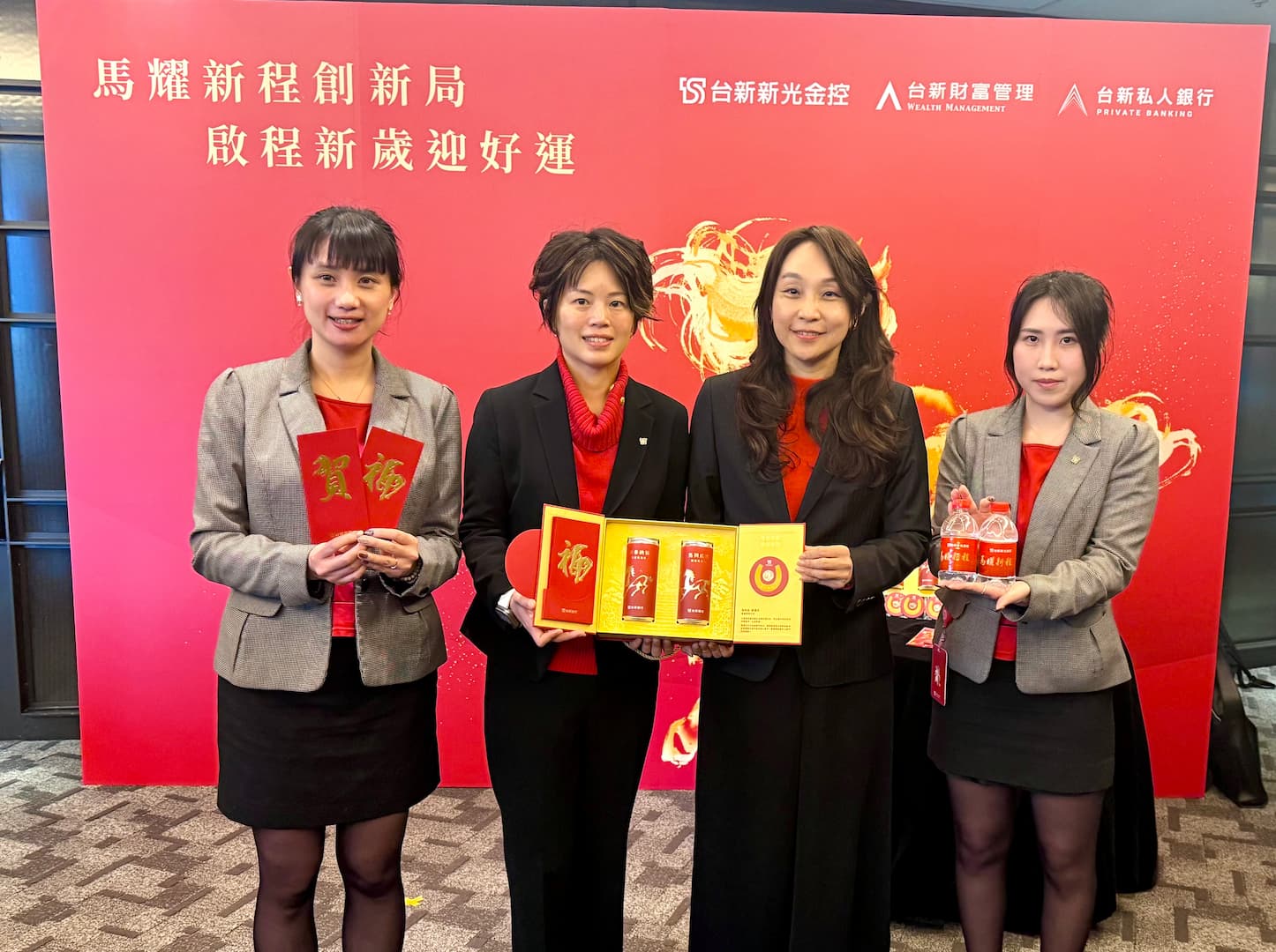 台新銀行個人金融事業總處執行長包國儀表示,2026 年是台新金控與新光金控攜手同行的元年,今年以「雙馬奔馳 駿啟新局」為設計核心理念,而開運水分配到各分行後,預計將選黃道吉日擺放在金庫至少 1 天,瓶身以雙馬馳騁於山水之間為意象,象徵穩固與源源不絕的生機。