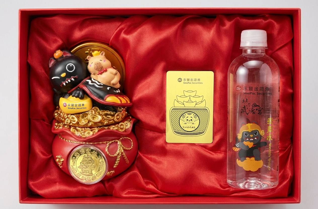 永豐金證券今年攜手「北港武德宮」推出限量 16,000 份聯名招財年節禮盒,包含鑲有武德宮錢母的「黑皮巴拉聚寶盆」、「五路亨通發財水」,並與國內首創將股票禮品卡結合,化為送存股金的「招財存股開運卡」,已在各證券分公司回饋貴賓客戶。
