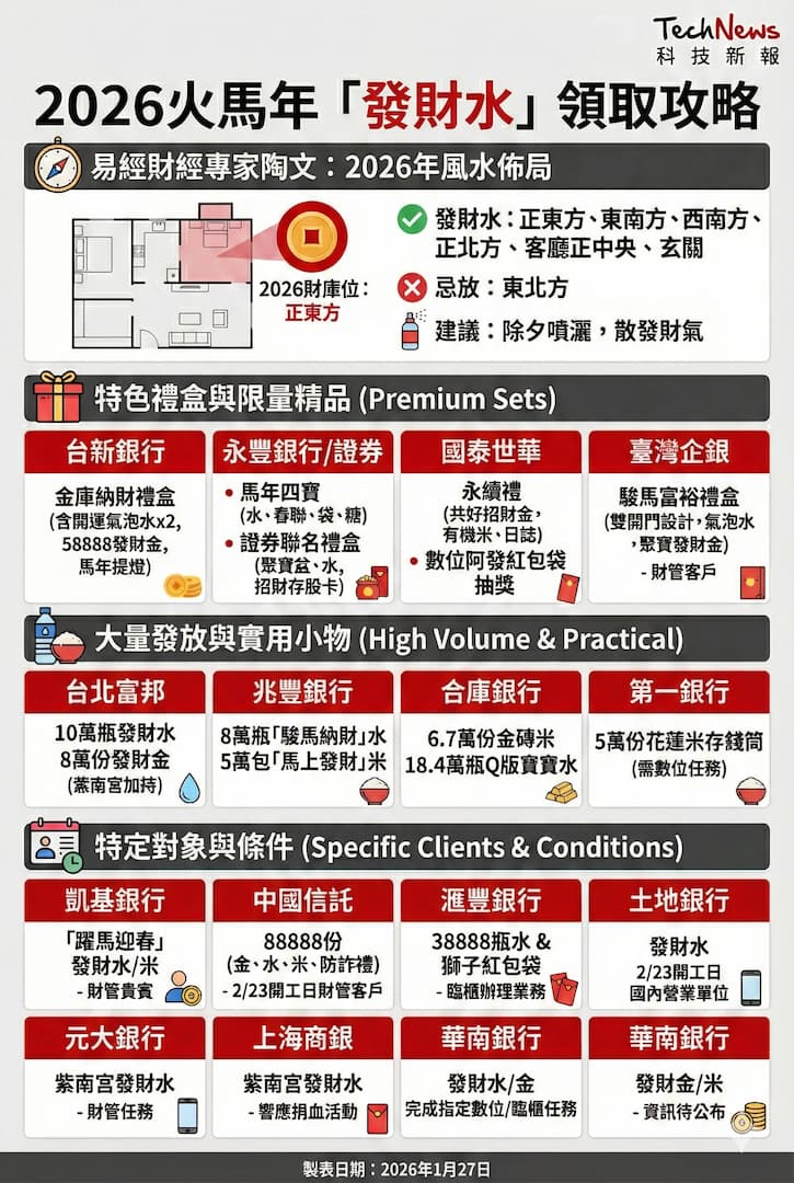 迎接農曆新春火馬年,全台 16 家銀行準備招財金、發財水等開運小物要發送給民眾,本篇整理領取攻略一次看,而易經財經專家陶文分享,2026 年財庫在「正東方」,建議發財水可放在「正東方、東南方、西南方、正北方、客廳正中央、玄關」,但切忌放在「東北方」。