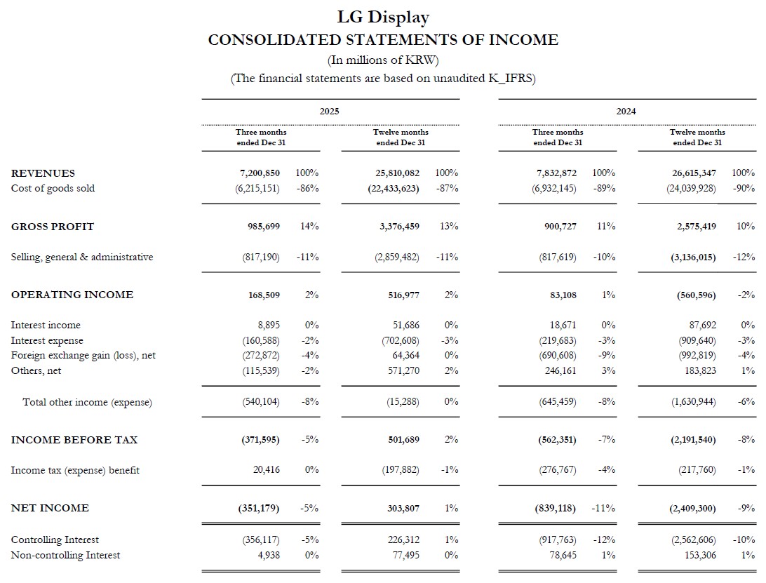 LG Display財報顯示,2025年第四季營收為7.20兆韓圜,年減8%;營業利益1,685億韓圜,年增幅高達103%,顯示獲利結構明顯改善。累計全年營收25.81兆韓圜,營業利益較前一年的虧損5,606億韓圜,大幅改善近1兆韓圜。