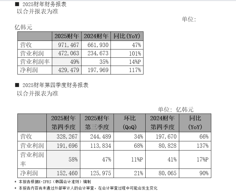 韓國記憶體大廠SK海力士發佈截至2025年12月31日的2025財年及第四季財務報告。公司2025財年營收為97.1467兆韓圜,營業利益為47.2063兆韓圜,營業利潤率為49%,淨利潤為42.9479兆韓圜,淨利率為44%。SK海力士表示,此次業績遠超2024年創下的歷史最高記錄,營收年成長逾30兆韓圜,營業利潤也達到翻倍增長,刷新了歷史最高年度業績。