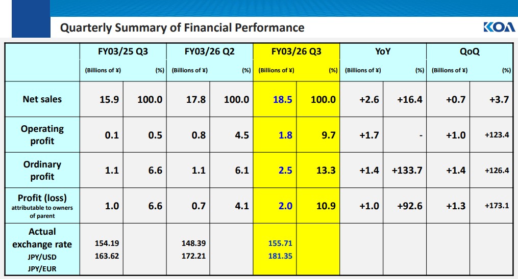 KOA 28日盤後公布上季(2025年10-12月)財報:以中國為中心的車用需求、以及亞洲資料中心等AI相關需求強勁,帶動合併營收較去年同期大增16.4%至184.6億日圓、合併營益狂飆19倍(狂飆1,900%)至18億日圓、合併純益暴增92.6%至20.1億日圓。