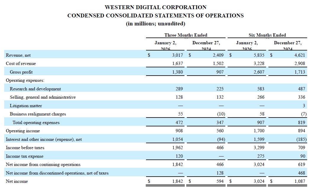 根據WD公布的財報資料,2026會計年度第二季(截至2026年1月2日)營收強勁年增25%至30.2億美元,優於華爾街預期的29.2億美元;毛利率從去年同期的38.4%攀升至46.1%;若排除一次性費用,調整後每股盈餘為2.13美元,同樣高於華爾街預估的1.91美元。