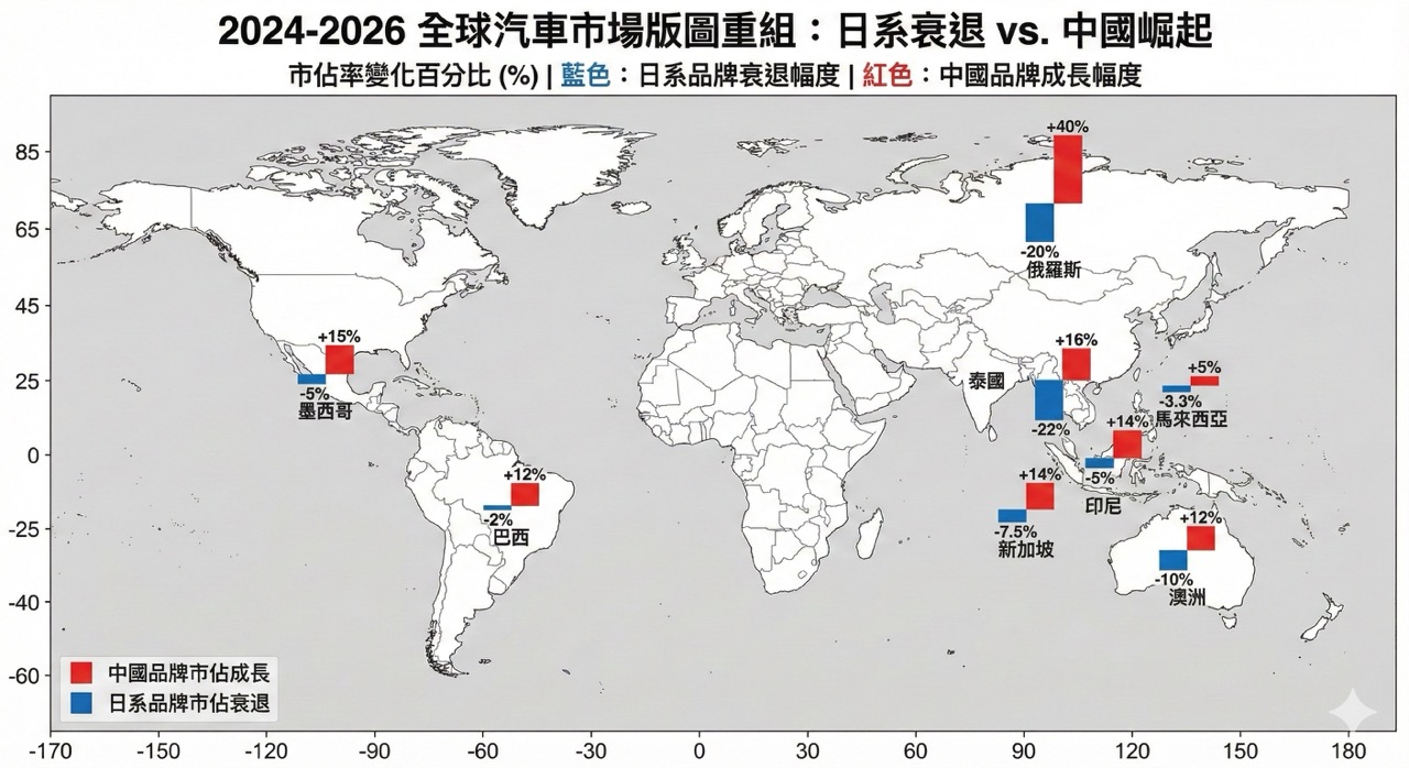 泰國是東協第二大汽車市場,也是日本重要的海外製造基地,2025 年銷售量約為 60 萬輛,在疫情前日系品牌的市占率穩定在 90% 以上,然而 2025 年日系品牌市占率已經下降到 70%,可以概略換算成少了 12 萬輛,做為參考,台灣 2025 年全年新車銷售量是 41 萬輛。
