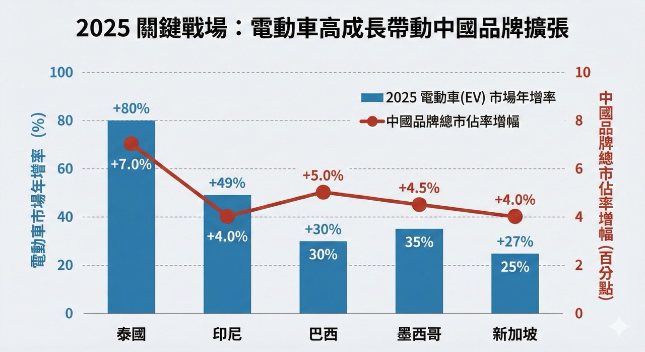 ▲ 2025 年中國車在這些市場快速成長的主因,與電動車成長高度正相關。(Source:科技新報製,部分數據為預估值)
