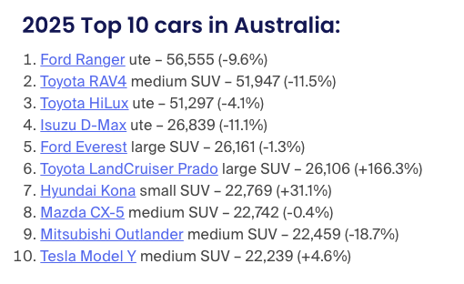 ▲ 澳洲 2025 年十大熱銷車款,日系車只有 LandCruiser Prado 有增長,其餘全都衰退。(Source:RACV)