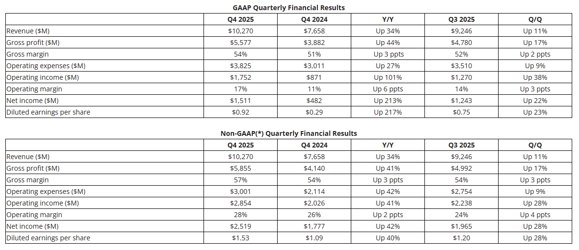 CNBC、路透社等外電報導,AMD 3日美股盤後公布Q4財報:營收年增34%至創紀錄的102.70億美元;經調整的非一般公認會計原則(Non-GAAP)每股盈餘為1.53美元,高於去年同期的1.09美元;Non-GAAP毛利率為57%,高於去年同期的54%。根據LSEG調查,分析師原本預測Q4營收、Non-GAAP每股盈餘將達96.7億美元、1.32美元。