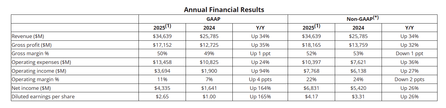 綜觀 2025 年全年,AMD 總營收來到創紀錄的 346 億美元。以 non-GAAP 計算,全年營業利益達 78 億美元,淨利 68 億美元,EPS 則為 4.17 美元。AMD 執行副總裁暨財務長 Jean Hu 指出,這份成績單證明了公司在規模化營運下實現獲利成長的能力,特別是創造了破紀錄的自由現金流,為未來的策略性投資提供了充足銀彈。