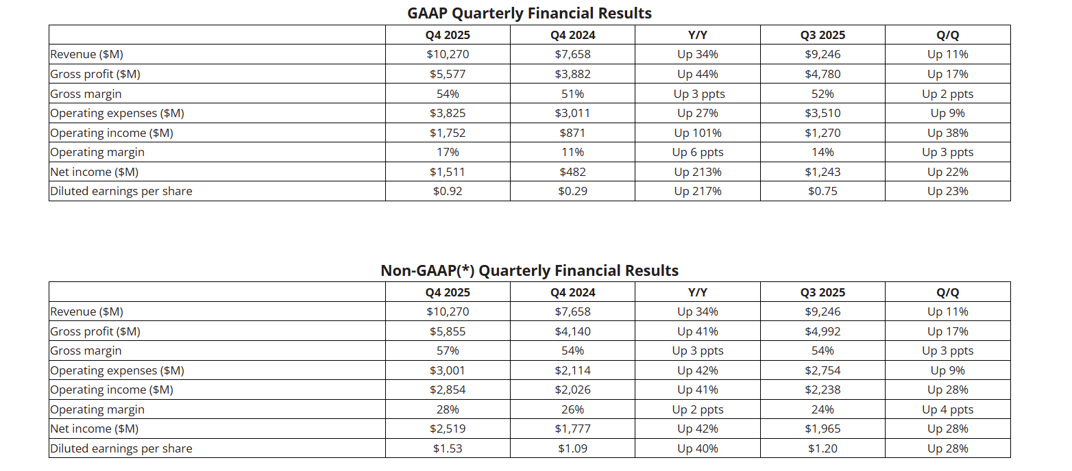 根據 AMD 公布的最新數據,第四季財報表現亮眼,營收金額達到 103 億美元,創下單季歷史新高。在獲利能力方面,若以非美國一般公認會計原則(non-GAAP)計算,毛利率達到 57%。營業利益為創紀錄達 29 億美元。淨利為 25 億美元。EPS來到 1.53 美元,同創歷史新高。以 GAAP 標準計算,EPS 則為 0.92 美元。