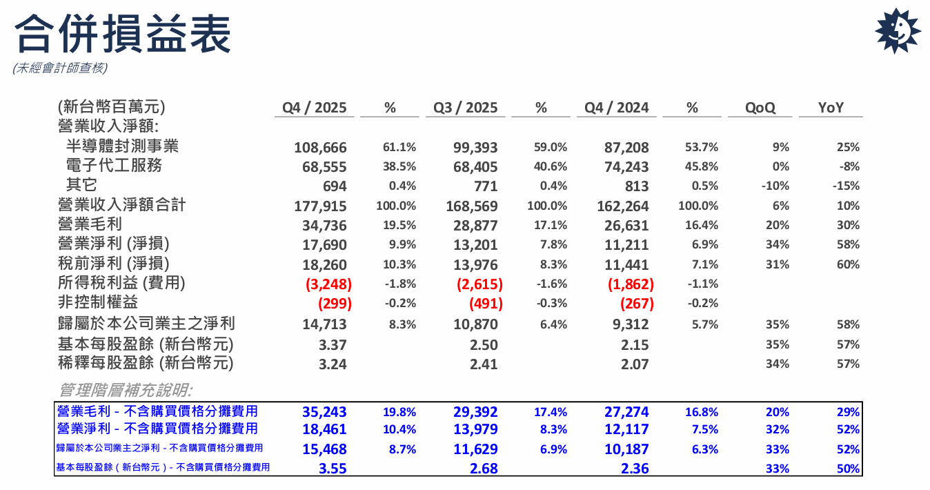 作者 | 發布日期 2026 年 02 月 05 日 17:35 | 分類 半導體 , 封裝測試 , 財報 line share Linkedin share follow us in feedly line share