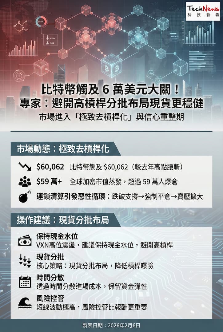 比特幣今日一度觸及 60,062 美元,相較於去年 10 月高點已腰斬,台灣加密貨幣交易所 HOYA BIT 創辦人彭云嫻指出,目前全球加密市值在短時間內大幅蒸發,超過 59 萬人爆倉,顯示市場正在進行一場極致的「去槓桿化」,整體市場已正式進入成本保衛戰。