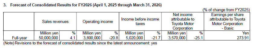 豐田汽車6日公布財報新聞稿指出,因日圓走貶、新車銷售穩健,今年度(2025年度、2025年4月-2026年3月)合併營收目標自原先(2025年11月時)預估的49兆日圓上修至50兆日圓(將年增4.1%),年度別營收將史上首度站上50兆日圓大關,創下歷史新高紀錄,合併營益目標自3.4兆日圓上修至3.8兆日圓(將年減20.8%)、合併純益目標自2.93兆日圓上修至3.57兆日圓(將年減25.1%)。