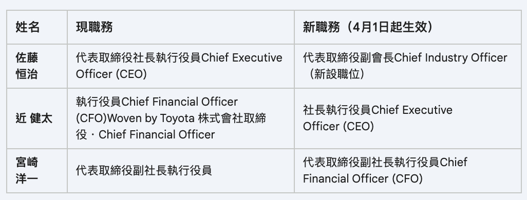 近健太需要等到 6 月股東會表決後,才能正式成為「代表取締役社長」,而佐藤恒治將成為「副會長」並兼任新設立的「產業長」(Chie Industry Officer)一職,財務長將由副社長宮崎洋一接任。