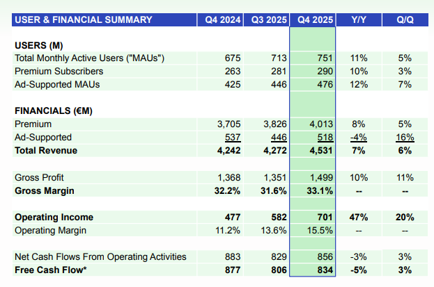 巴隆周刊等外媒報導,Spotify公布,2025年第四季,營收年增7%至45.3億歐元,經調整每股盈餘為4.43歐元,大幅優於分析師預估的2.74歐元;毛利率為33.1%,高於市場預期的32.9%;付費用戶數增加約900萬人,也超乎分析師預期。