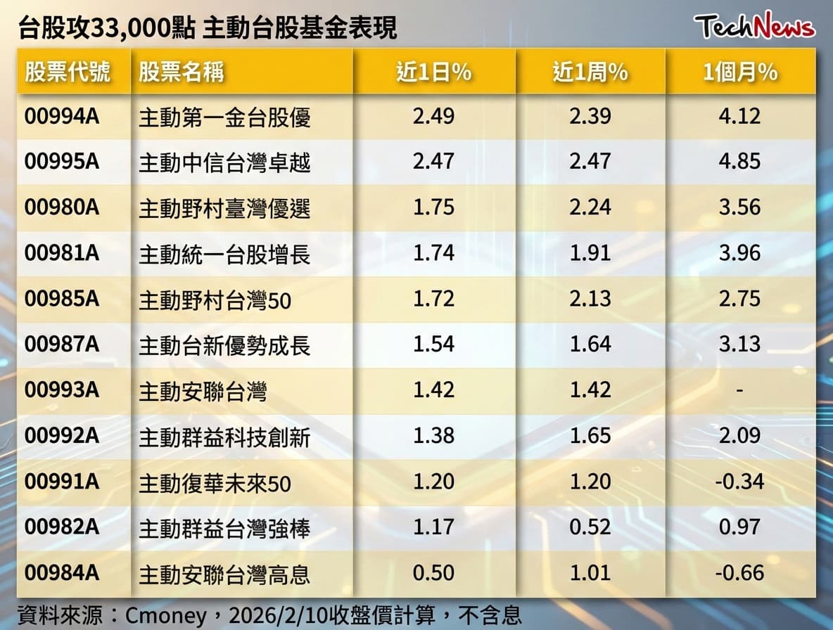 觀察這波台股上攻,哪些台股 ETF 追強勢、選股能力最強?觀察近一個主動台股 ETF 新兵表現,其中主動第一金台股優、主動中信台灣卓越(00995A)表現最為亮眼,近一個月漲幅分別達 4.12% 及 4.85%。