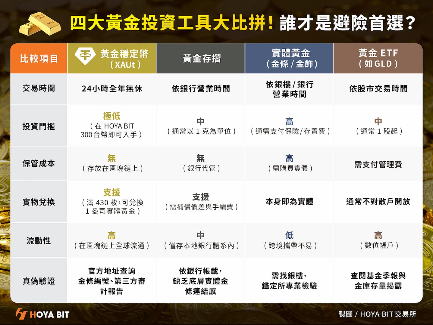 黃金作為傳統避險資產,現貨價格年初一度衝破每盎司 5,600 美元,創歷史新高,同時一場席捲全球的「代幣化黃金」熱潮正在成形,台灣加密貨幣交易所 HOYA BIT 看準資產代幣化(RWA)趨勢,趁著這波熱潮上架黃金穩定幣 XAUt(Tether Gold),本篇整理四大黃金投資工具一次看。