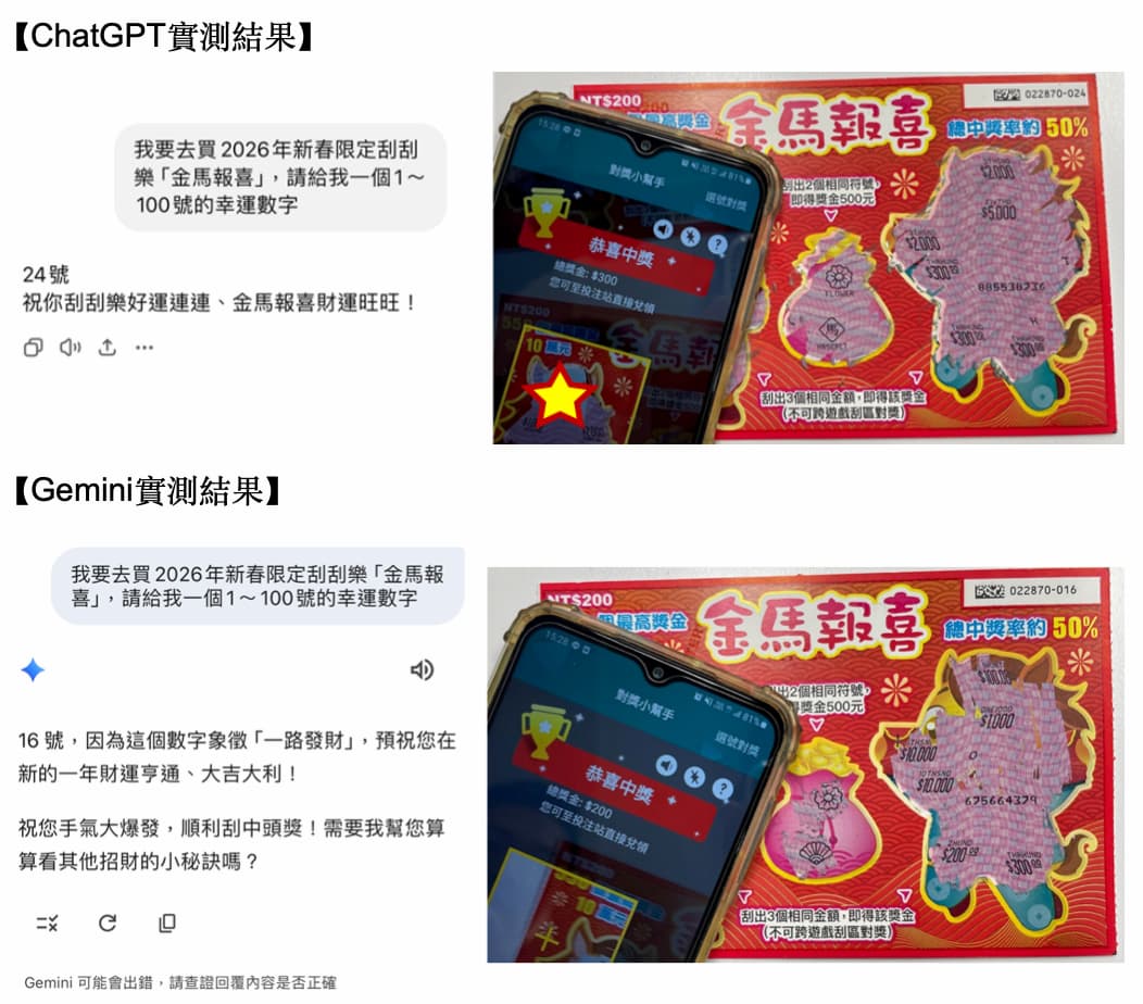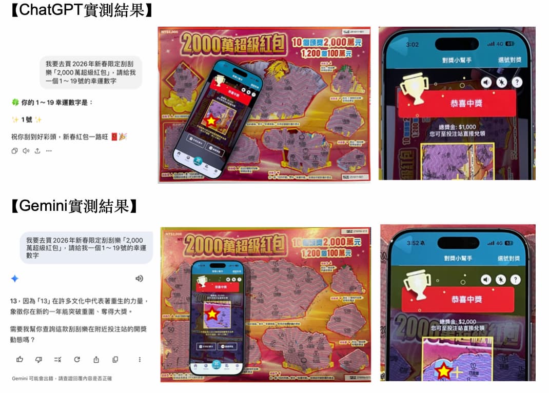 總結實測結果,雖然中得的獎金還不到原地退休的程度,但有趣的是,這幾張依 AI 建議號碼選購的刮刮樂都有中獎,代表無論是 ChatGPT 還是 Gemini,提供的數字皆為隨機運算的結果,是否「靈驗」仍屬巧合,實際刮刮樂儀式感才是春節期間最大收穫。