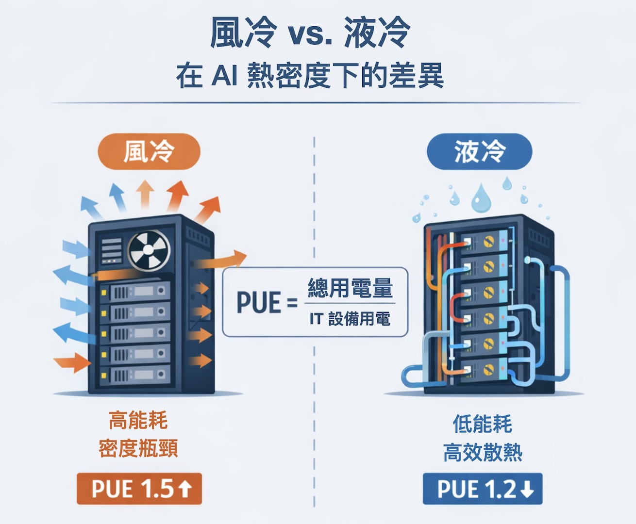 當機櫃功耗從十多 kW 走向數十 kW、甚至朝百 kW 以上邁進時,多數資料中心會遇到兩個現實:第一,冷卻用電急速增加,空調得加大噸數、風扇轉得更快,冷卻本身變成一個巨大的電力黑洞;第二,佈建受到限制,熱排不掉,機櫃就得降規上架或被迫分散部署,就算 GPU 到了、電也談下來,算力卻上不去。 實務上,風冷在 20~30 kW/櫃附近就開始吃力,風扇與空調能耗會隨熱密度急遽放大,讓整體 PUE(Power Usage Effectiveness,能源使用效率)卡在 1.5 上下,很難再往下壓。