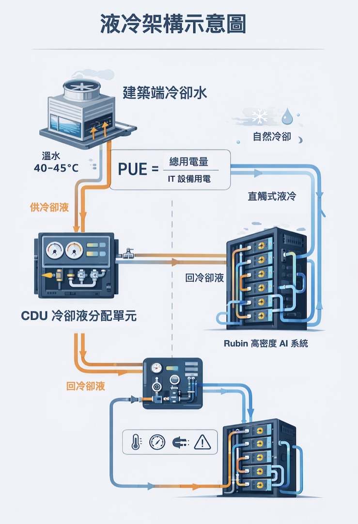 一個常被提起的門檻是,風冷系統在 20~30 kW/櫃附近就開始進入效率遞減區,風扇與空調用電會隨熱負載急遽放大,直到 PUE 卡在 1.5 左右下不來;Rubin 世代的 AI 機櫃卻往 300 kW 甚至更高推進,這種差距已經不是多裝幾台空調就能填平。 也因此液冷對資料中心的意義不只是機房變得比較涼,而是讓同一間變電所的容量,可以支撐數倍於過去的 GPU 算力密度,把「一度電」榨出更多有用的運算結果。