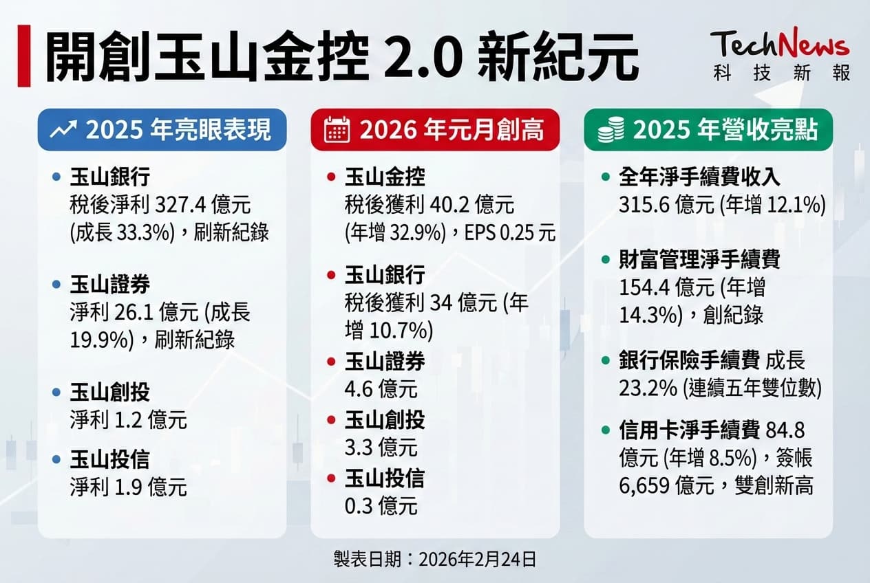玉山金公告 2025 年各子公司表現良好,玉山銀行稅後淨利 327.4 億元,成長 33.3%,玉山證券淨利 26.1 億元,成長 19.9%、玉山創投淨利 1.2 億元、玉山投信淨利 1.9 億元,銀行與證券獲利刷新歷史紀錄。