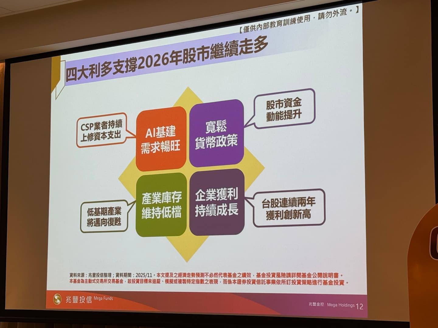 王仲良認為,台股擁有「四大利多」支撐,一是 AI 基礎建設需求持續暢旺,帶動硬體供應鏈獲利;二是全球貨幣政策趨於寬鬆,資金動能充沛;三是產業庫存已調整至低檔,回補需求浮現;四是企業獲利預期重回成長軌道。