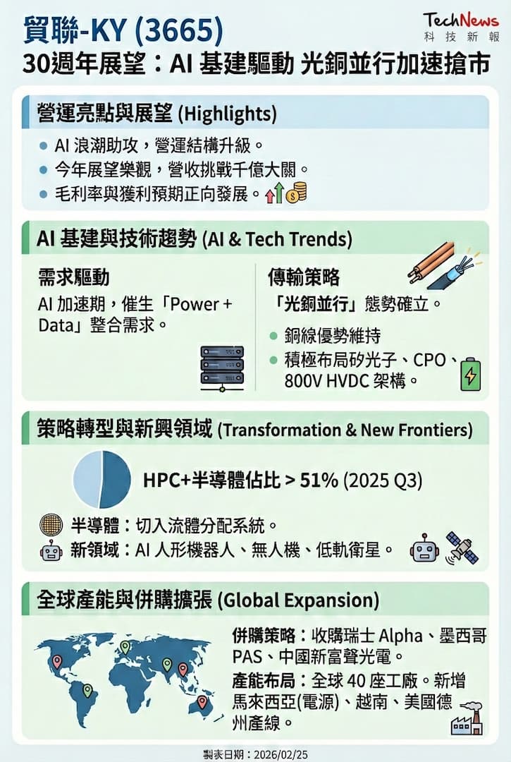 貿聯-KY 今日舉辦成立 30 週年度展望,董事長梁華哲表示,受惠 AI 浪潮帶動大電源與高速傳輸產品需求,貿聯已成功實現營運結構升級,對今年展望抱持樂觀態度,預期全年營收有望延續去年成長動能朝千億元大關邁進,而毛利率將呈正向發展,進一步推升獲利表現。