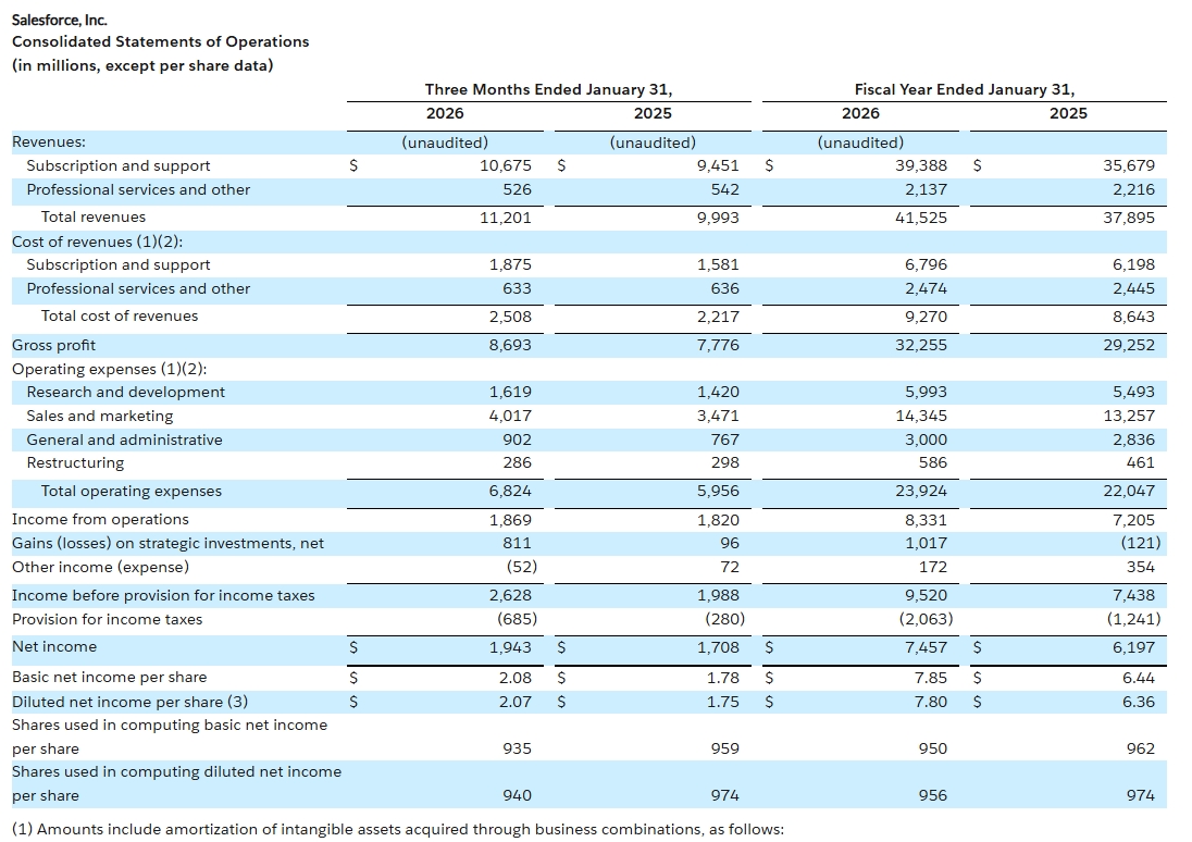 綜合外媒報導,Salesforce於25日美股盤後公布,2026會計年度第四季(截至2026年1月31日為止),營收年增12%至112億美元,經調整每股盈餘為3.81美元,均優於LSEG統計的分析師預估值。