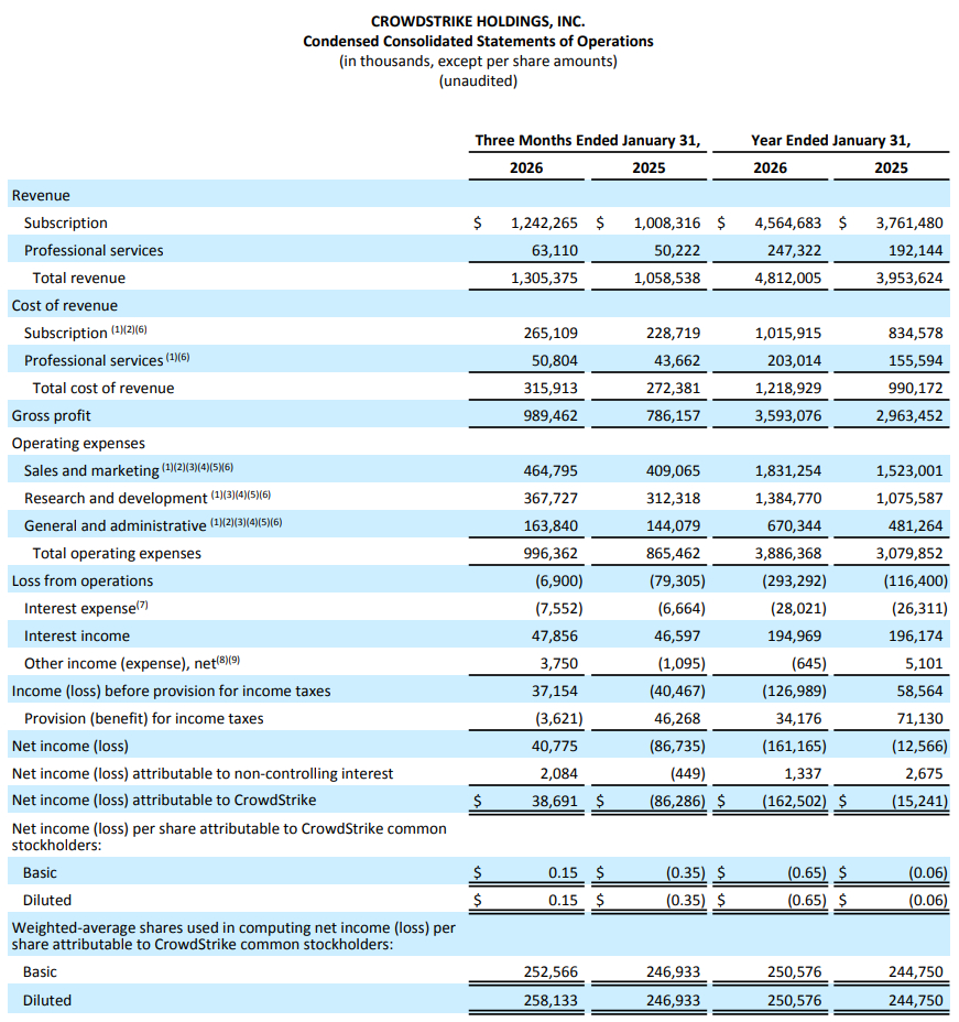 根據CrowdStrike 3日美股盤後公布的最新財報,2026會計年度第四季(截至2026年1月31日止),營收年增23%至13.1億美元,優於FactSet調查所預期的13億美元;淨利3,870萬美元,即每股盈餘0.15美元,擺脫去年同期淨損8,630萬美元,即每股虧損0.35美元的虧損窘境。