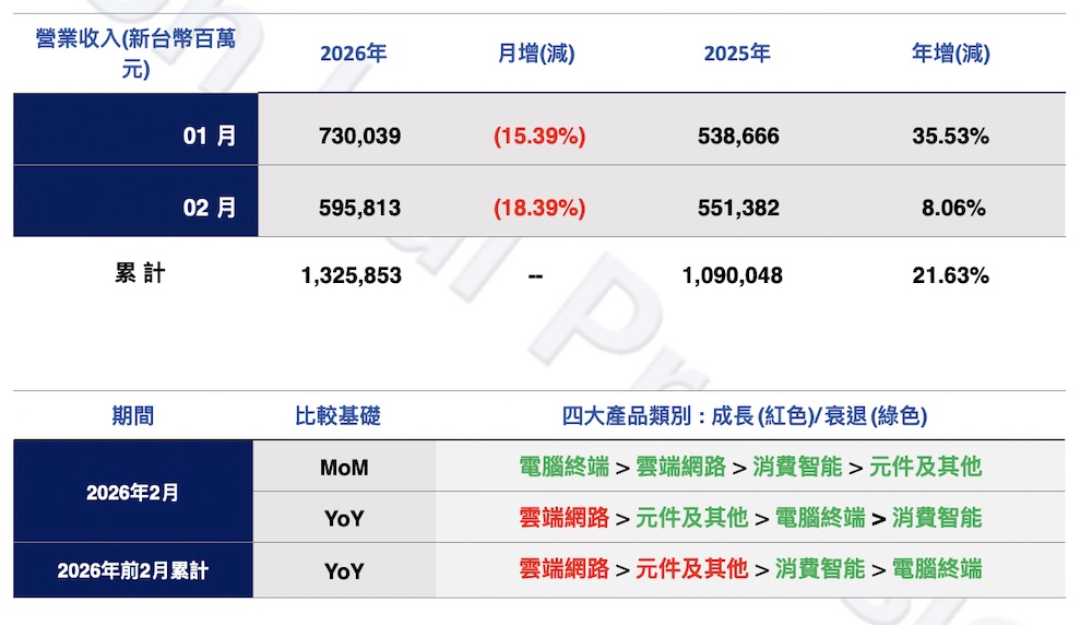 鴻海表示,2 月營收雖受農曆春節假期影響,工作天數較少,使各主要產品線較 1 月出現不同程度下滑,但在 AI 雲端產品需求持續強勁帶動下,整體營收仍較去年同期成長,並寫下歷年同期新高表現。