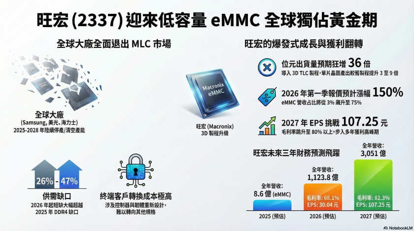 根據報告指出,隨著全球記憶體大廠全面退出 MLC(Multi-Level Cell)市場,低容量 eMMC 將迎來史無前例的「結構性缺貨」與價格飆漲,旺宏有望在 2028 年成為全球「唯一」的低容量 eMMC 供應商。預期這波爆發性成長將帶動旺宏在 2026 年強勢轉虧為盈,並步入長達數年的黃金獲利週期。
