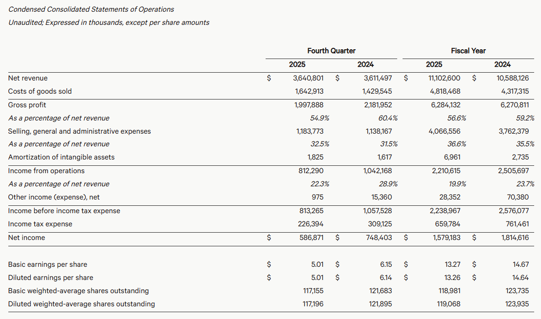 綜合外媒報導,lululemon 17日美股財報後公布,2025會計年度第四季(截至2026年2月1日為止),營收年增1%至36.4億美元,經調整每股盈餘5.01美元,均優於LSEG統計的分析師預估值;受關稅影響,當季毛利率下降550個基點。