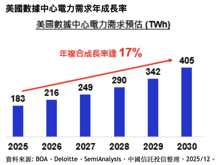 隨著科技巨頭發現 AI 相關基礎建設「跟不上」的事實,開始大力投資,而 AI 投資將從上半場的先進晶片競逐,轉向下半場的 AI 基礎建設拚場,其中主架構完全離不開「算力」及「電力」,因此中國信託投信推出「中信美國數據中心及電力 ETF(009819)」,預計 4 月 7 日展開募集。