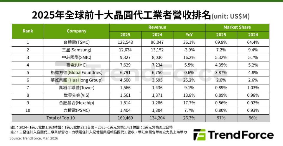 根據市場研究及調查機構 TrendForce 的最新數據顯示,受惠於全球 AI 基礎設施的建置狂潮,全球前十大晶圓代工廠 2025 年的總營收高達 1,695 億美元,較 2024 年大幅成長了26.3%。然而,這波龐大的市場紅利呈現出極度集中的趨勢。