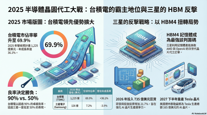 而造成三星晶圓代工業務難以吸引新客戶的主因,在於其備受考驗的良率問題。根據韓國朝鮮日報(Chosun Ilbo)在 2025 年的報導,三星晶圓代工的良率一度低至 50%,這與台積電高達 90% 以上的卓越良率形成強烈對比。在造價昂貴的 AI 晶片領域,良率直接關乎客戶的成本與產品上市時間,這也是台積電能夠穩居霸主地位的重要護城河。